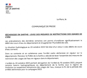 SÉCHERESSE EN SARTHE : Levée des mesures de restriction au 26/10/2023 Situation au 26/10/2023 : SÉCHERESSE EN SARTHE : Levée des mesures de restriction