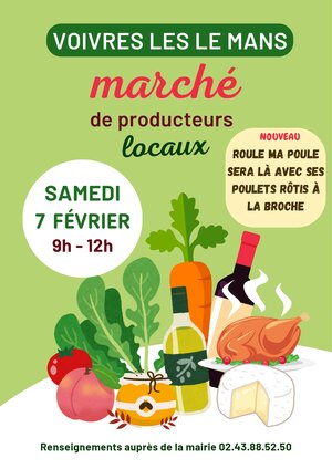 Marché de producteurs locaux Marché de producteurs locaux – Samedi 7 février à Voivres-lès-Le Mans, Place de l’Eglise Nouveauté : poulets rôtis avec Roule ma poule !🍗