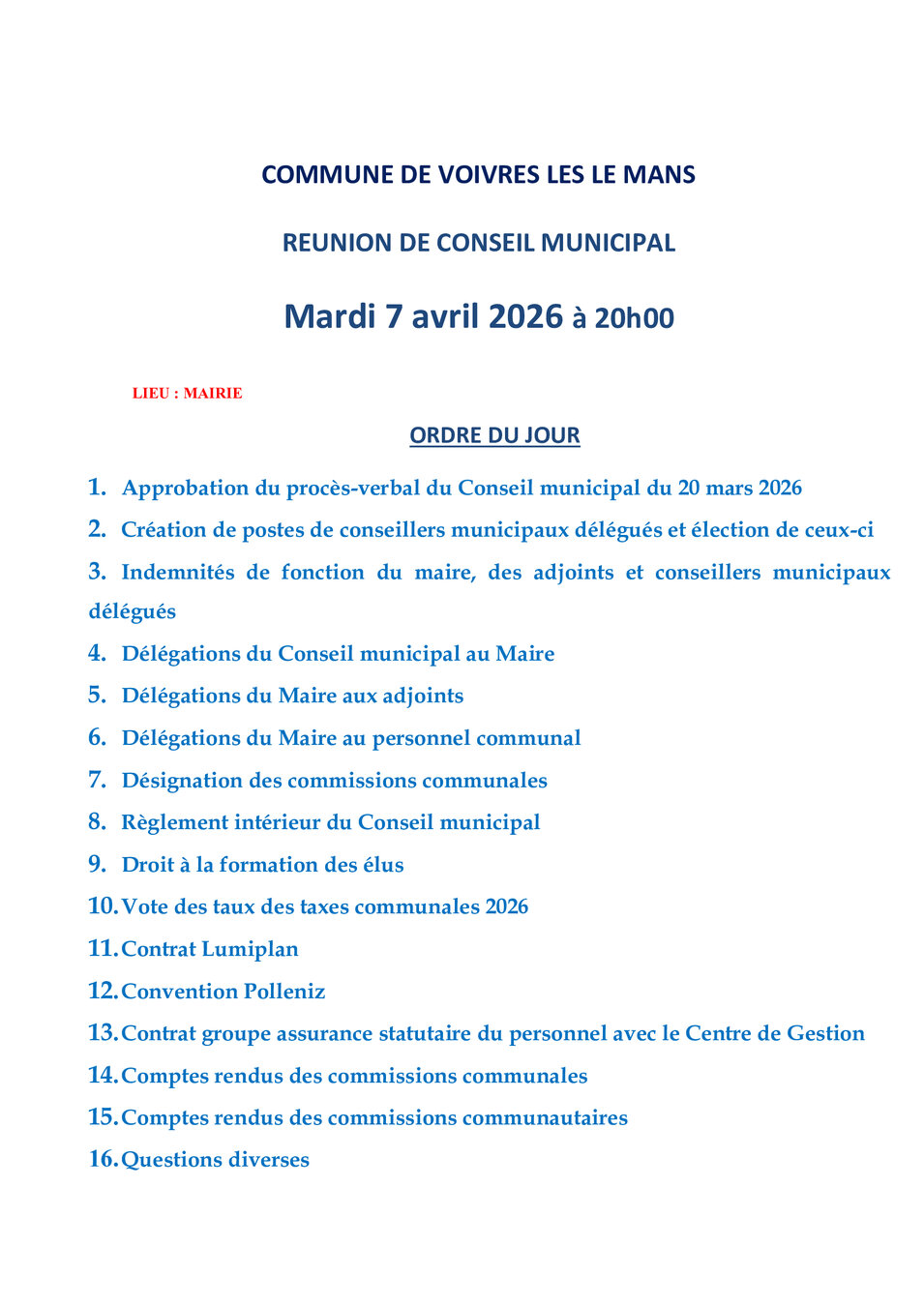 CONSEIL MUNICIPAL , MARDI 7 AVRIL 2026 - 20H - Mairie